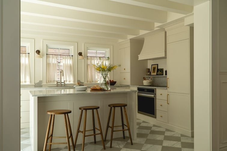 To bring the kitchen’s classic-modern tone to life, they selected our SANNE cabinet door—a fresh, clean-lined shaker profile. The finish, Chantilly Lace, adds just the right touch of warmth and depth while maintaining a light, elegant foundation. Set against soft checkerboard tile floors and warm brass hardware, the result is effortlessly cohesive.